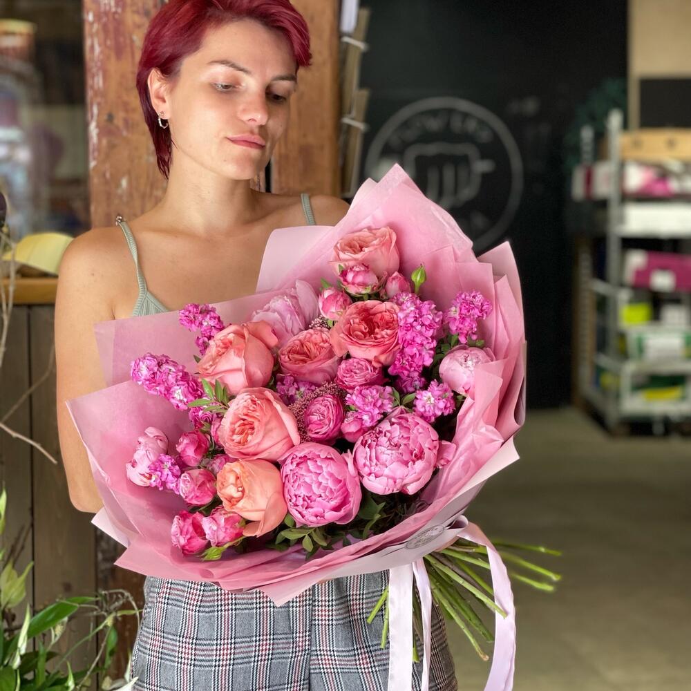 Маттиола – 7 шт.Роза кустовая пионовидная – 3 шт.Пион Сара Бернар – 4 шт.Упаковка дизайнерская – 1 шт.роза пинк экспрешн – 4 шт.