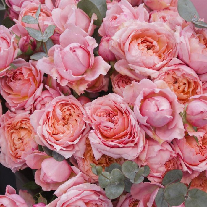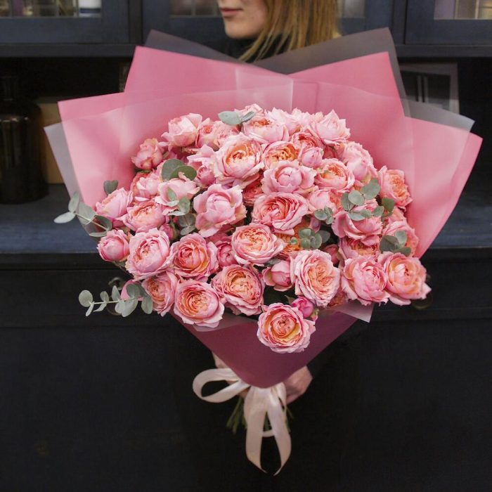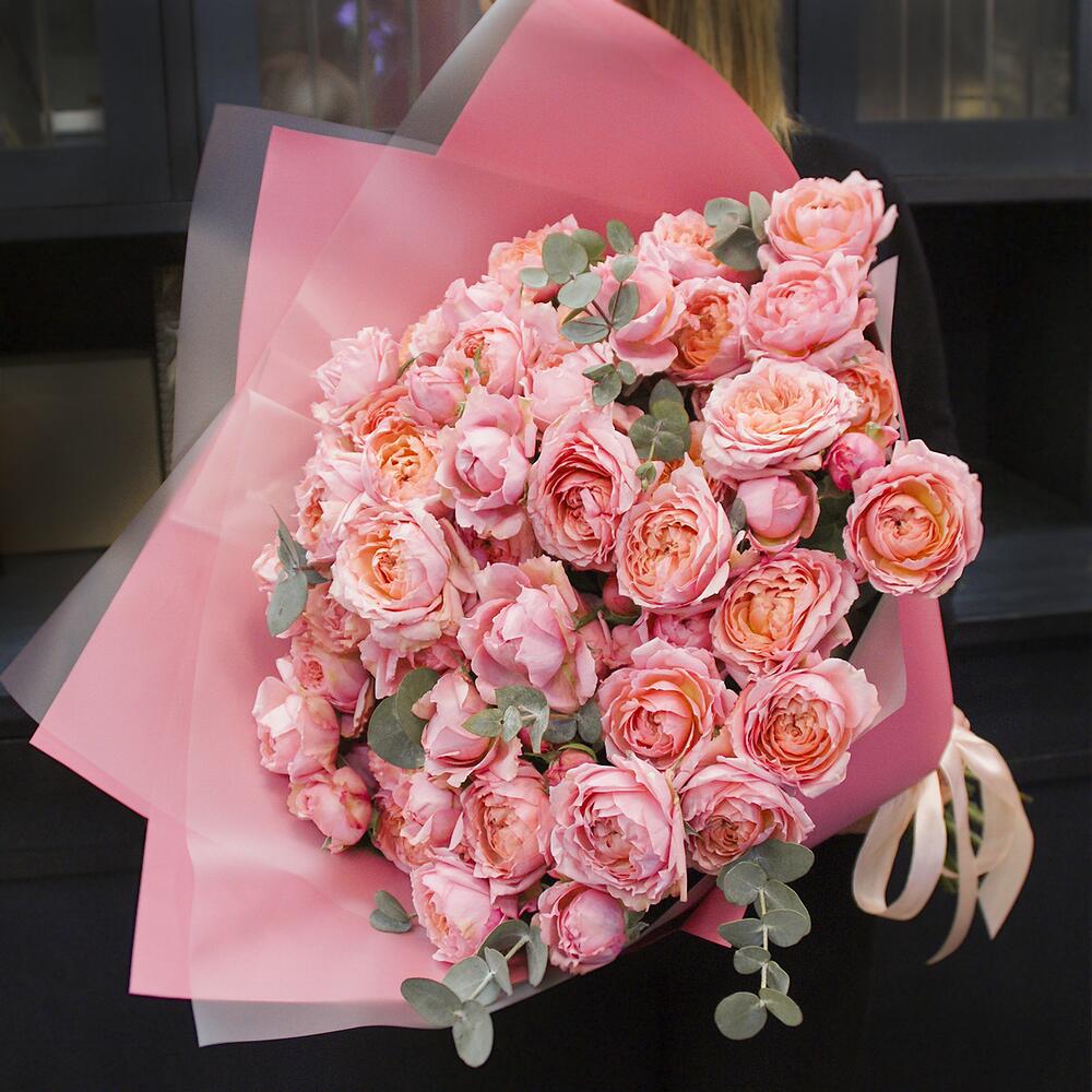 Большой букет из 15 кустовых пионовидных роз Джульетта с эвкалиптом