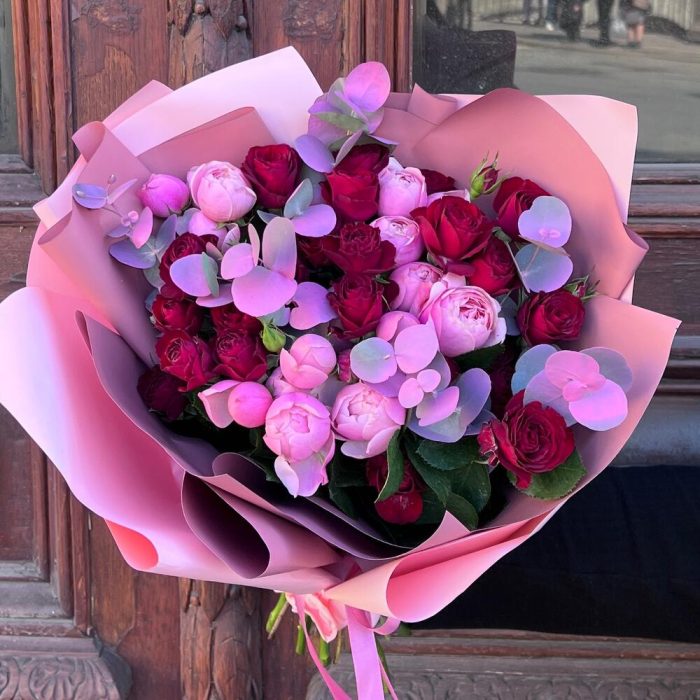 Лента атласная – 2 шт.Пленка матовая – 7 шт.Эвкалипт крашеный – 3 шт.роза кустовая пионовидная сильва пинк – 4 шт.роза кустовая ред трендсеттер – 5 шт.
