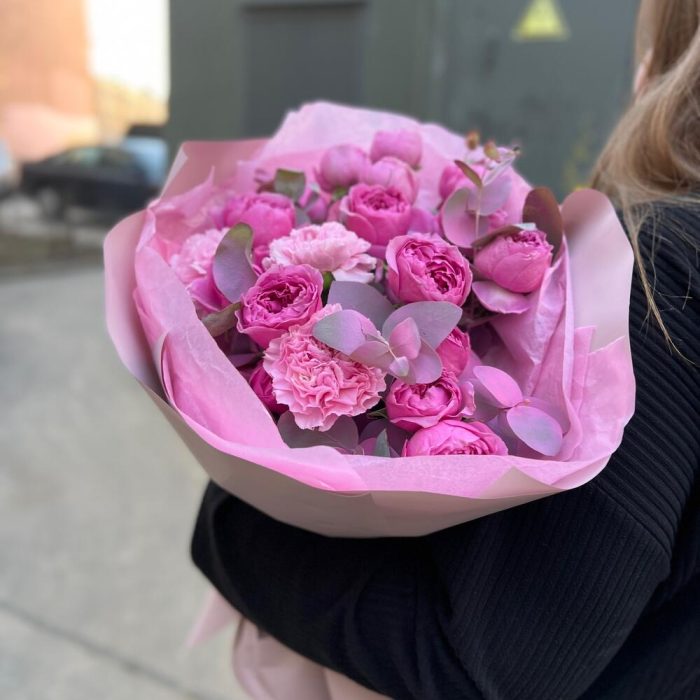 Эвкалипт – 3 шт.Лента атласная – 2 шт.Тишью – 3 шт.Диантус – 3 шт.Пленка матовая – 7 шт.роза кустовая пионовидная мисти бабл – 5 шт.