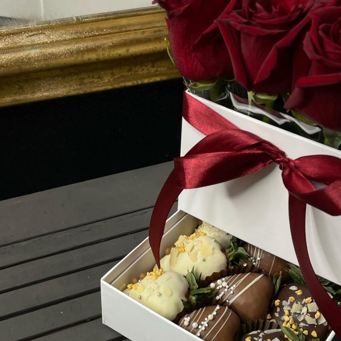 Лента атласная – 1 шт.Роза Эксплорер – 17 шт.Коробка квадратная – 1 шт.Оазис флористический – 1 шт.Клубника в шоколаде – 9 шт.