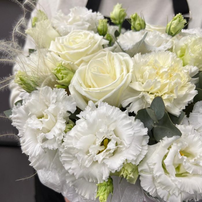 роза пионовидная плайя бланка – 3 шт.эустома махровая белая – 3 шт.Диантус – 3 шт.Эвкалипт – 2 шт.Оазис флористический – 1 шт.Коробка шляпная – 1 шт.Лента атласная – 2 шт.Тишью – 1 шт.Ковыль – 1 шт.