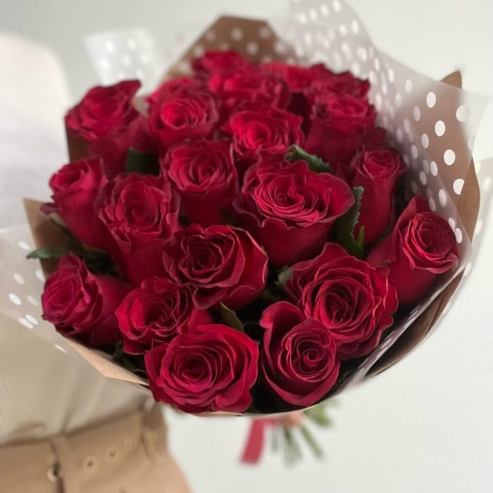 цветы роза – 21 шт.Упаковка крафт – 2 шт.Пленка дизайнерская – 2 шт.