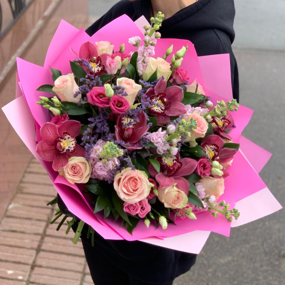 Роза – 11 шт.орхидея – 9 шт.Лизиантус – 5 шт.Маттиола – 5 шт.Лимониум – 2 шт.руссус – 5 шт.дезайнерская упаковка – 3 шт.Атласная лента – 1 шт.