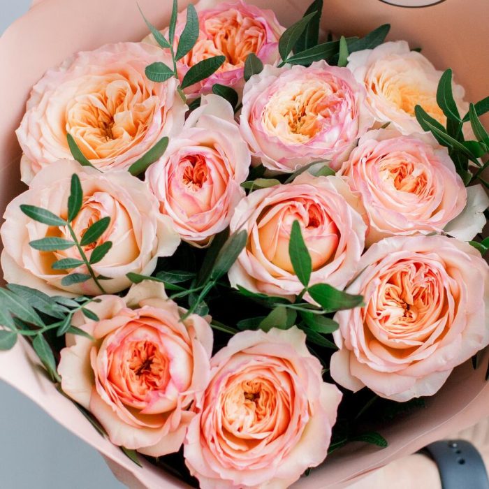 Букет из 11 персиковых пионовидных роз Flash Back 40 см с фисташкой в кремовой пленке