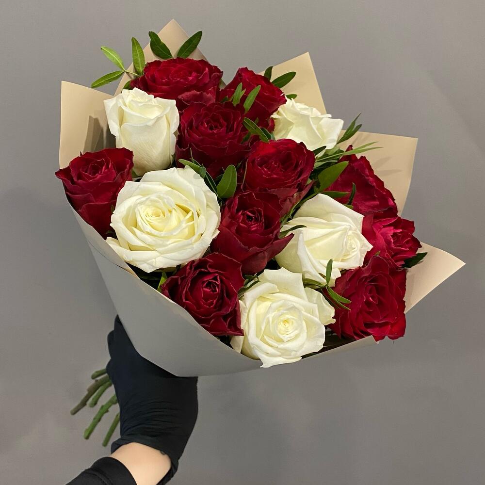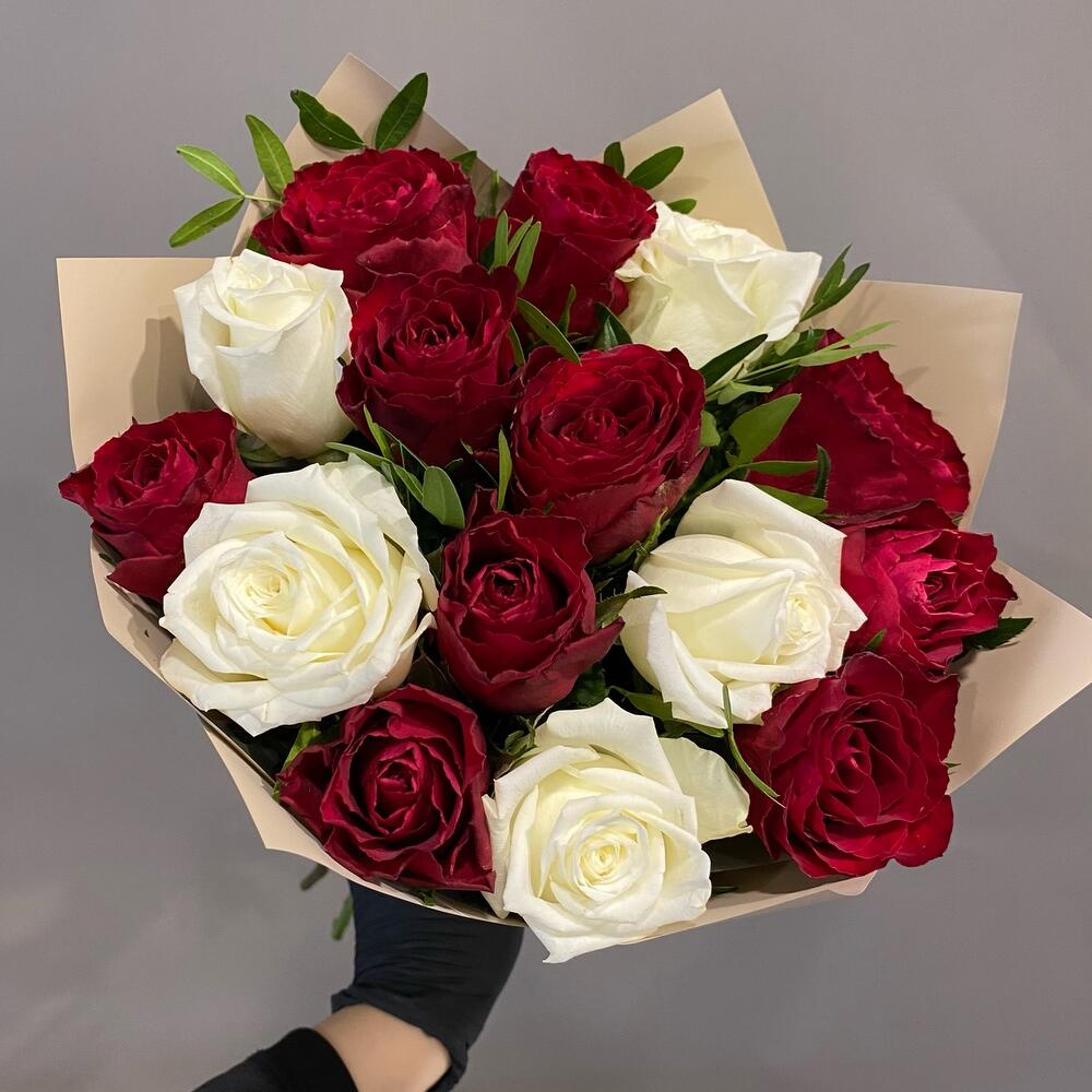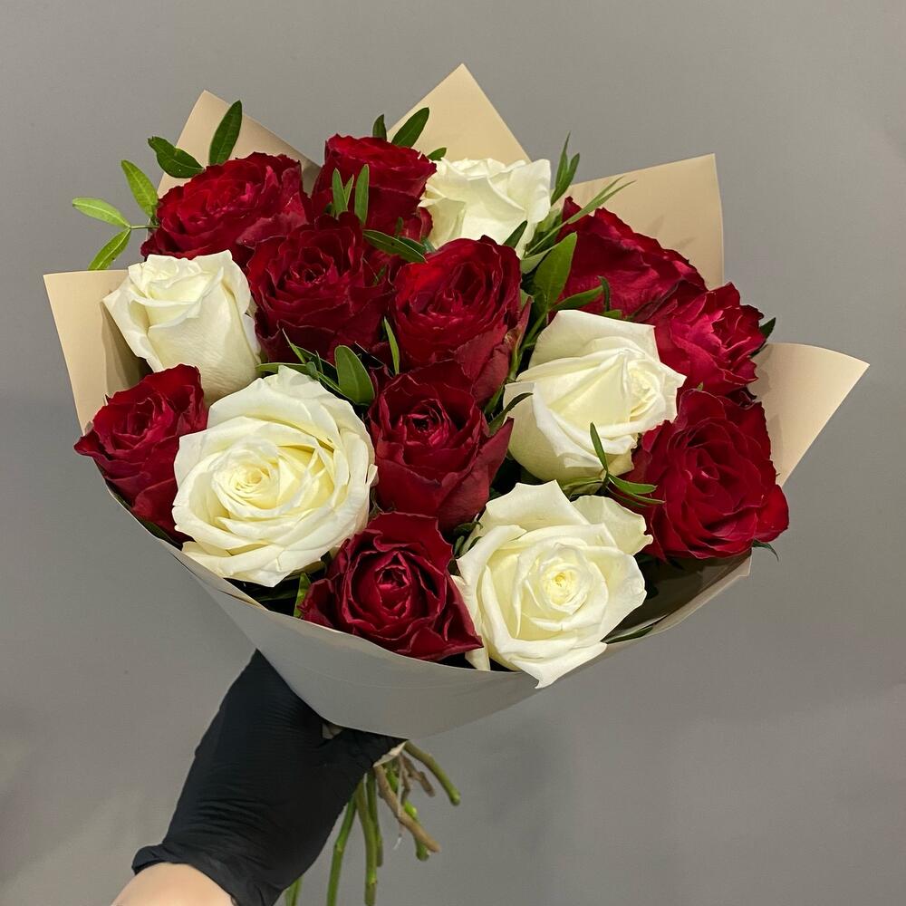 Роза белая премиум – 5 шт.Роза красная – 10 шт.Фисташка – 3 шт.Упаковка дизайнерская – 1 шт.Лента атласная – 1 шт.
