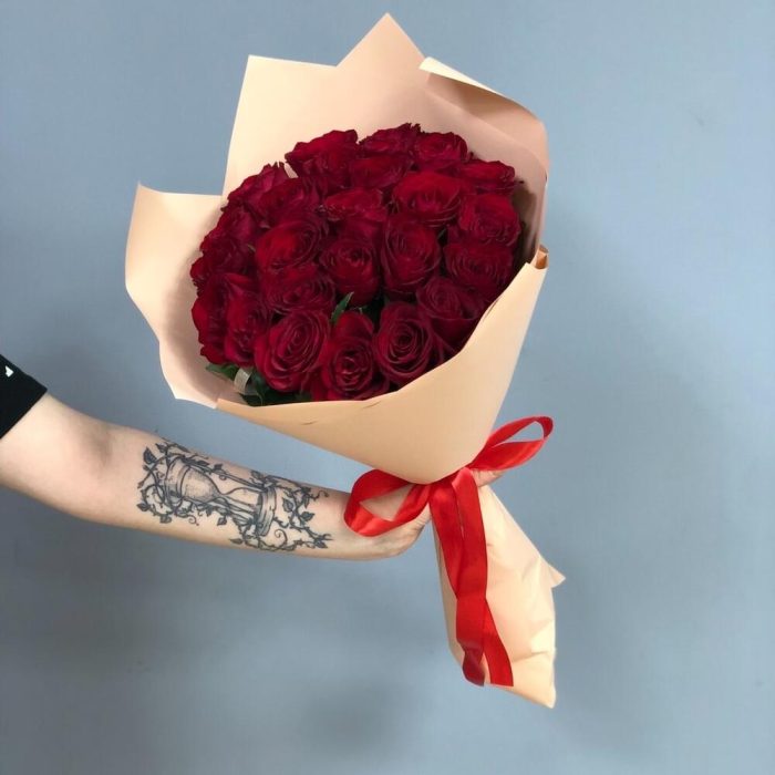 Букет из 25 красных роз в упаковке