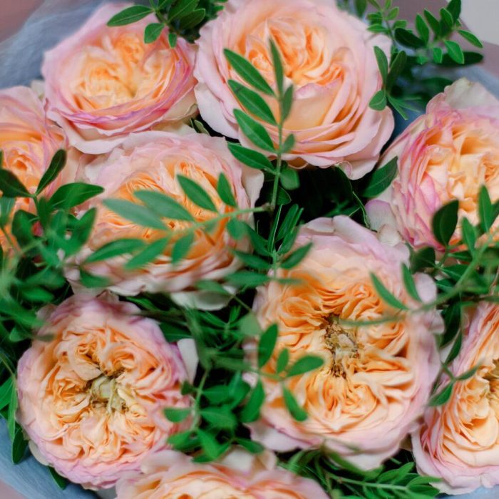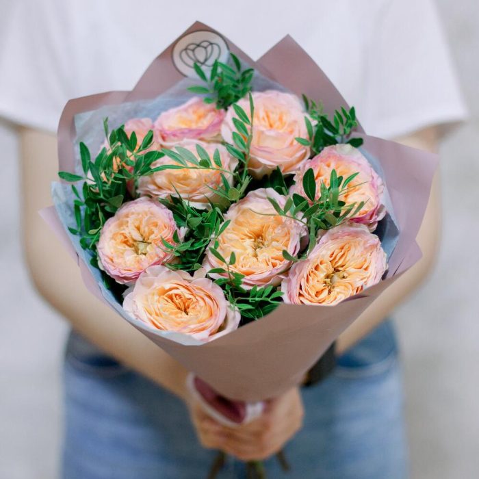 Букет из 9 персиковых пионовидных роз Flash Back c фисташкой