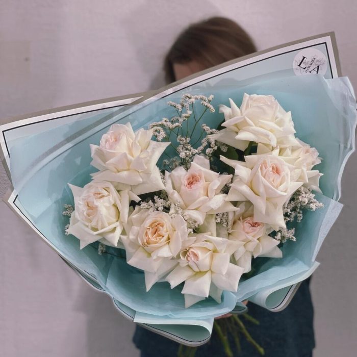 Лимониум – 4 шт.Тишью – 2 шт.Фисташка – 2 шт.Упаковка дизайнерская – 2 шт.роза охара пионовидная – 9 шт.