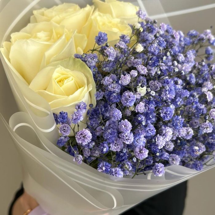 Гипсофила – 4 шт.Роза – 5 шт.Лента атласная – 1 шт.Упаковка дизайнерская – 2 шт.