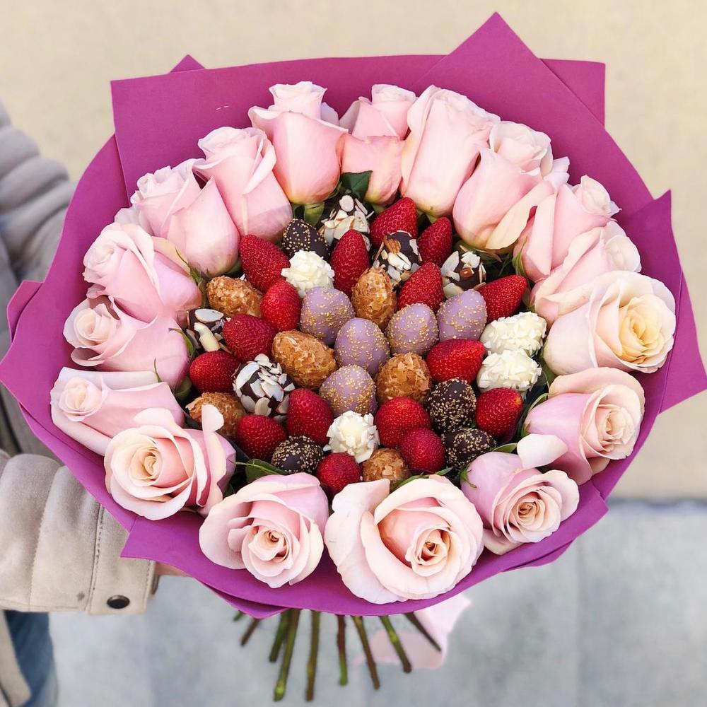 Букет из клубники в бельгийском шоколаде и роз
