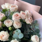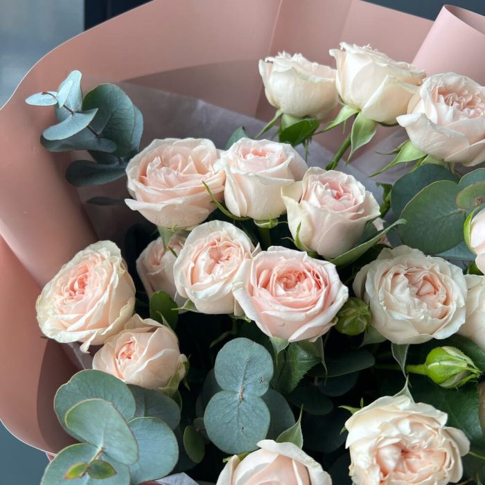 Кустовая пионовидная роза – 5 шт.Эвкалипт – 3 шт.декоративная упаковка – 1 шт.Атласная лента – 1 шт.