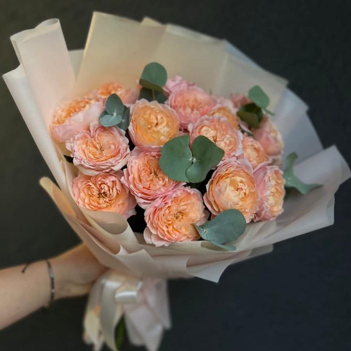 Букет из кустовой пионовидной розы Джульетта и эвкалипт