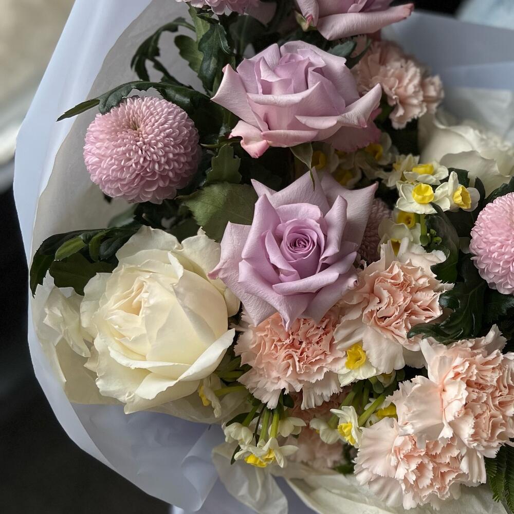 Букет из пионовидныз роз, нарциссов и хризантемы