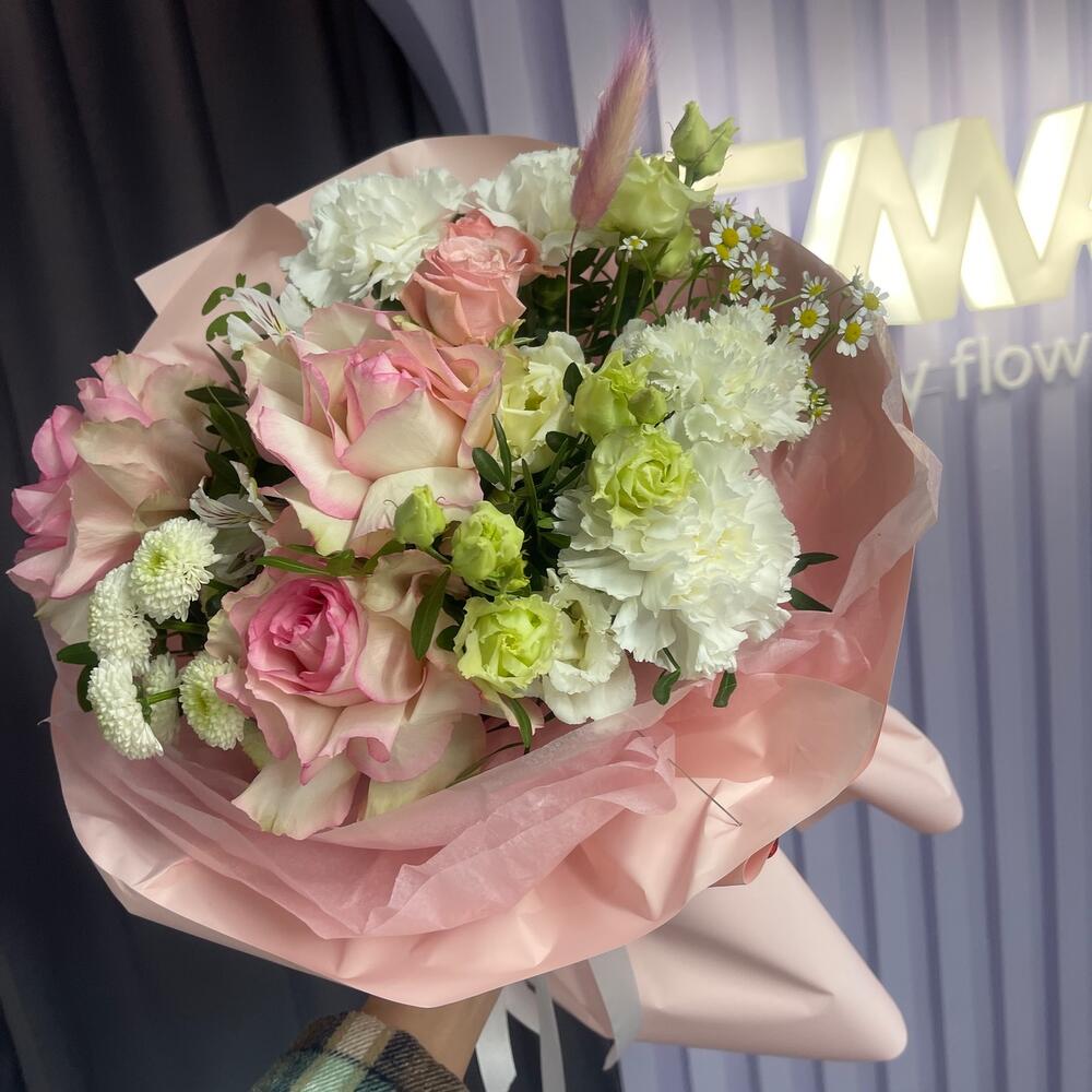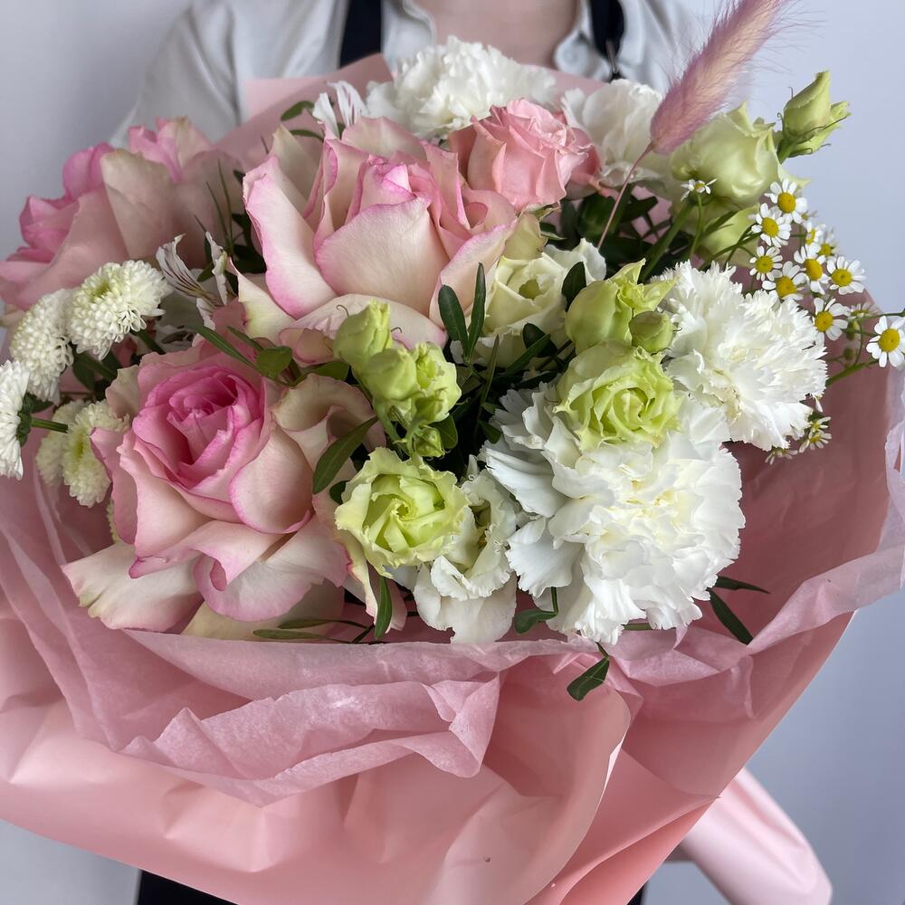 Сантини белая – 1 шт.Кустовая роза – 1 шт.Диантус – 3 шт.Пленка – 4 шт.Французская роза – 3 шт.эустома белая – 1 шт.фисиашка зелень – 4 шт.тиштю белая – 2 шт.