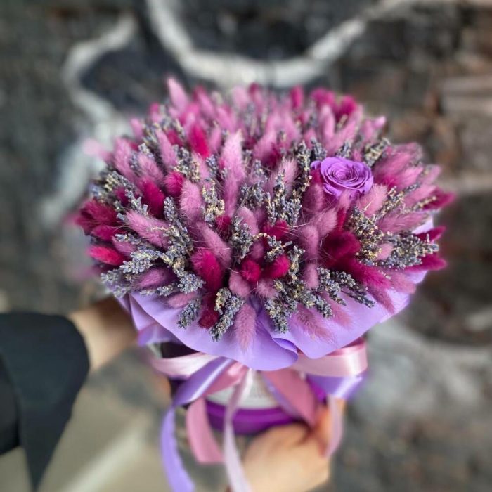 Букет из сухоцветов – лагуруса, лаванды и стабилизированной розы в шляпной коробке “Лиловые сны”