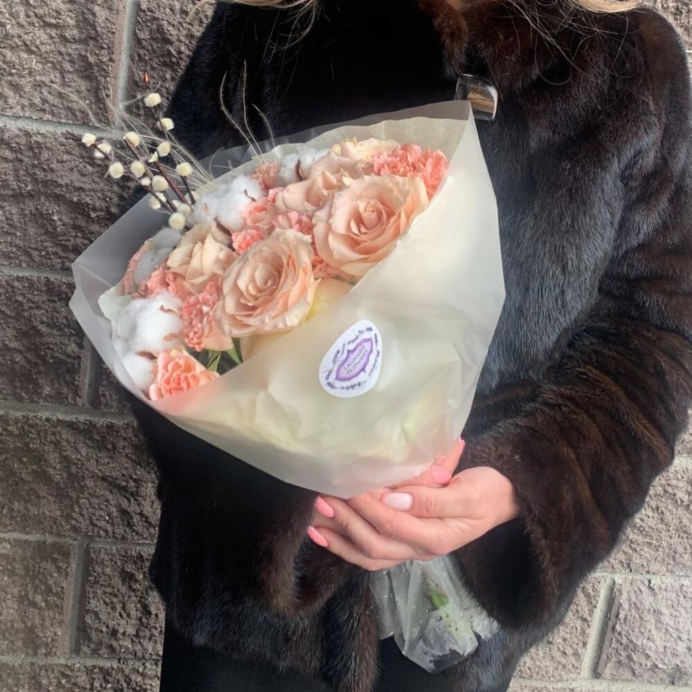 Роза Эквадор – 5 шт.Роза кустовая – 3 шт.Гвоздика – 4 шт.Хлопок натуральный – 4 шт.верба пучок – 1 шт.Упаковка дизайнерская – 1 шт.