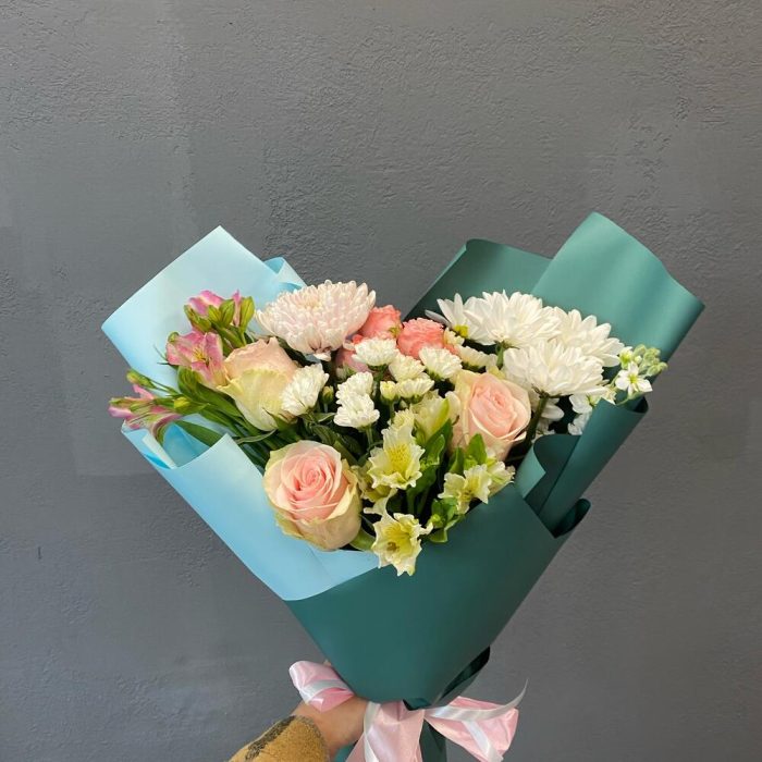 Альстромерия – 2 шт.Роза кустовая – 1 шт.Роза – 3 шт.Хризантема – 1 шт.Сантини – 1 шт.Упаковка дизайнерская – 2 шт.россана – 1 шт.