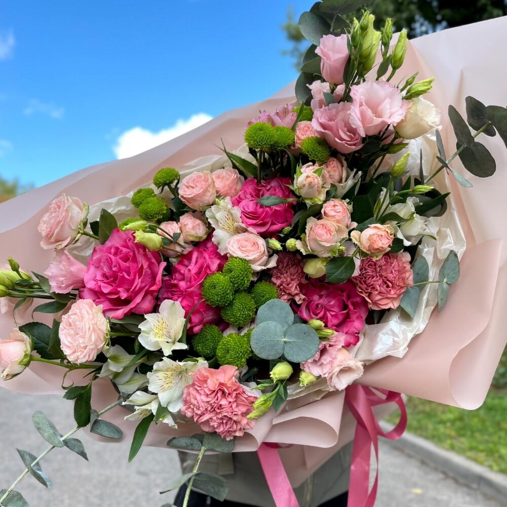 Альстромерии, Гвоздики, Кустовые розы, Лизиантусы, Розы, Хризантемы