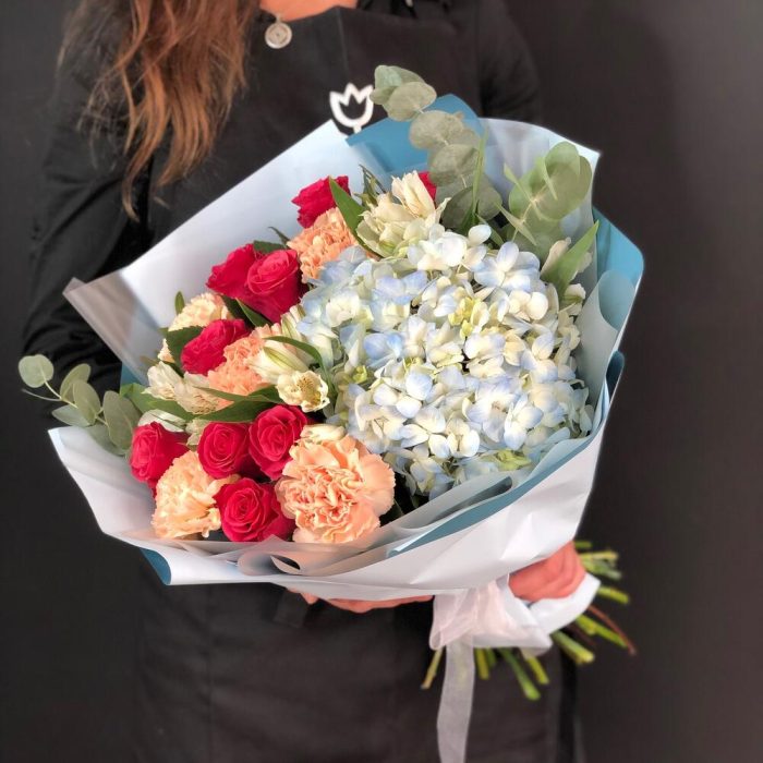 Гортензия – 1 шт.Роза Эквадор – 9 шт.Диантус – 5 шт.Эвкалипт – 2 шт.Альстромерия – 3 шт.Крафт упаковка – 3 шт.