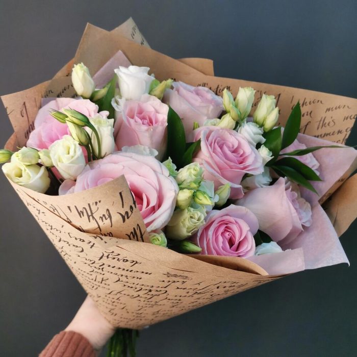 Роза Эквадор – 7 шт.Эустома – 5 шт.зелень декоративная – 5 шт.Упаковка дизайнерская – 1 шт.
