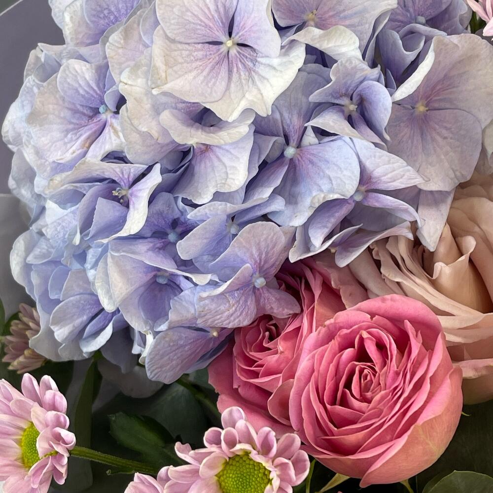 Гортензия – 1 шт.Лента – 1 шт.Роза кустовая – 2 шт.Хризантема Сантини – 3 шт.Эвкалипт – 1 шт.Роза одноголовая – 3 шт.Тишью – 1 шт.Упаковка дизайнерская – 1 шт.Лагурус – 6 шт.