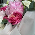 Букет с пионами и хризантемой в дизайнерском оформлении