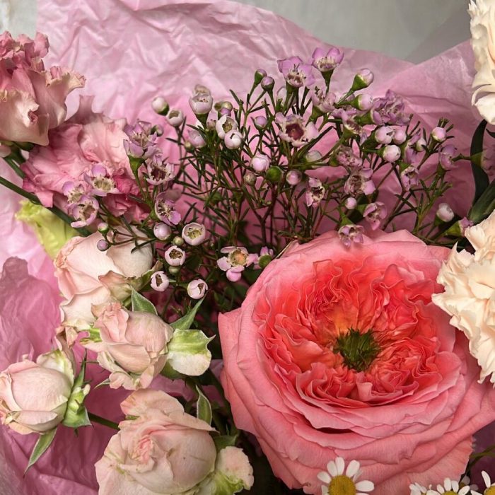 Роза пионовидная – 1 шт.Ваксфлауэр – 1 шт.Роза кустовая пионовидная – 1 шт.Гвоздика – 2 шт.Лизиантус – 1 шт.Матрикария – 1 шт.Упаковка дизайнерская – 1 шт.