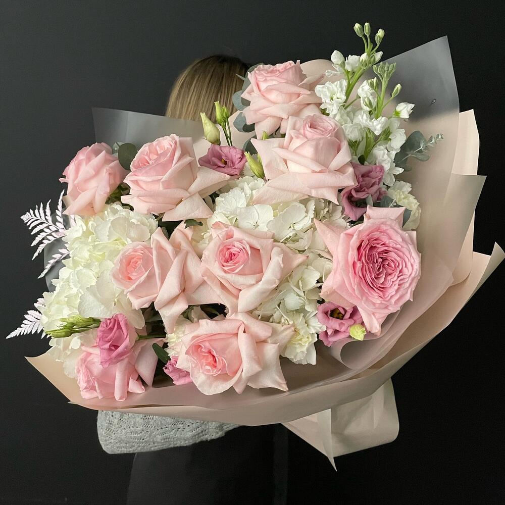 Букет с пионовидными розами и гортензиями