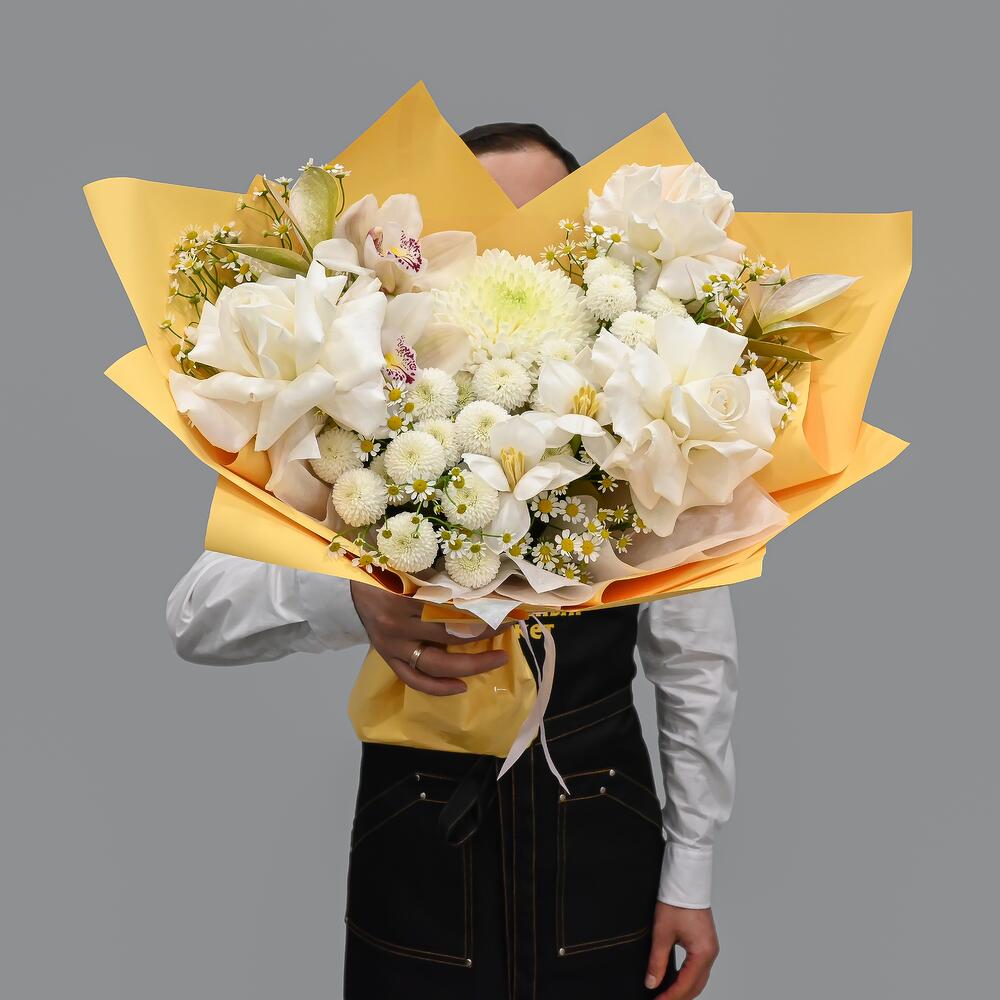 Орхидея Цимбидиум – 2 шт.Рускус – 3 шт.Тюльпан – 2 шт.Хризантема кустовая – 3 шт.Ромашка – 3 шт.Хризантема – 1 шт.Упаковка дизайнерская – 1 шт.Французская роза – 3 шт.