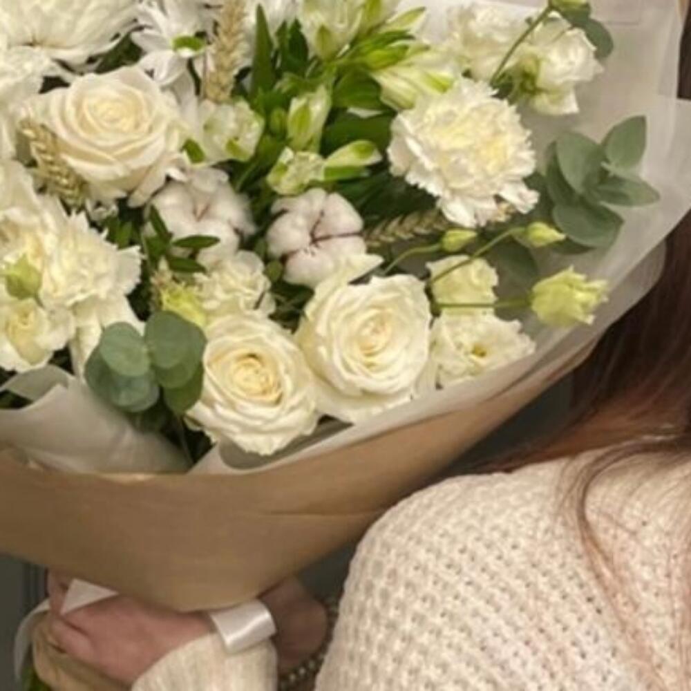 Альстромерия – 4 шт.Лизиантус – 3 шт.Хлопок – 2 шт.Хризантема кустовая – 3 шт.Эвкалипт – 1 шт.Роза – 3 шт.Гвоздика – 2 шт.Упаковка дизайнерская – 1 шт.зелень декоративная – 1 шт.
