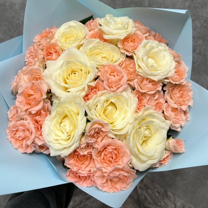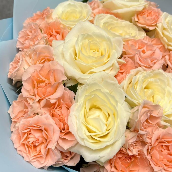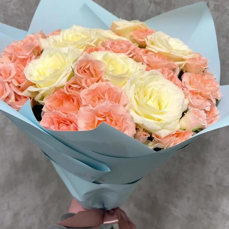 Роза кустовая – 20 шт.Лента атласная – 1 шт.Упаковка дизайнерская – 1 шт.Роза аваланж 50 см – 7 шт.