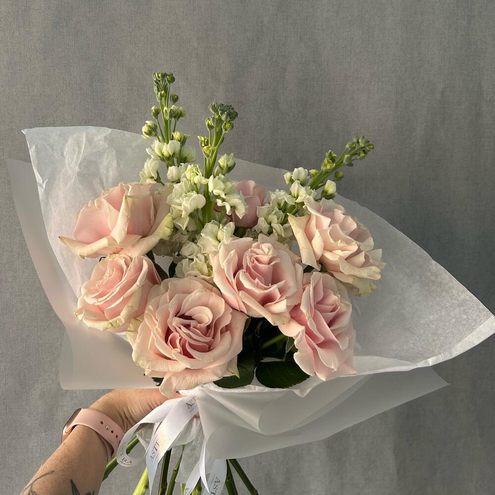 Лента атласная – 1 шт.Маттиола белая – 3 шт.Авторская упаковка – 1 шт.пинк мондиаль роза – 7 шт.