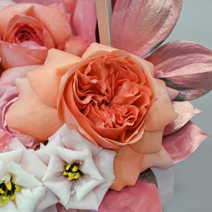 Французская роза – 3 шт.Лист магнолии – 2 шт.Гвоздика – 3 шт.Рускус – 4 шт.Эустома – 1 шт.Кустовая пионовидная роза – 2 шт.Ящик деревянный – 1 шт.Тишью – 1 шт.