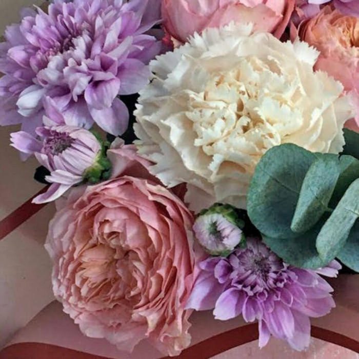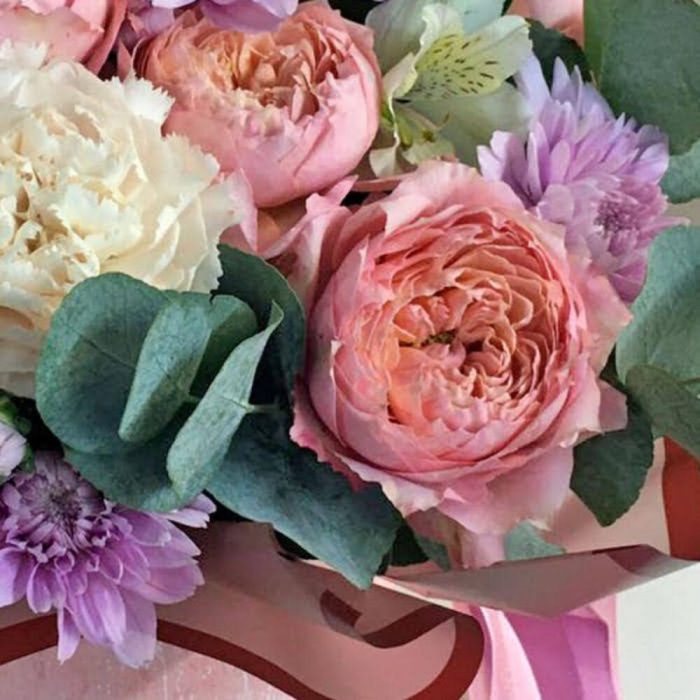 Альстромерии, Гвоздики, Кустовые розы, Лизиантусы, Розы, Хризантемы