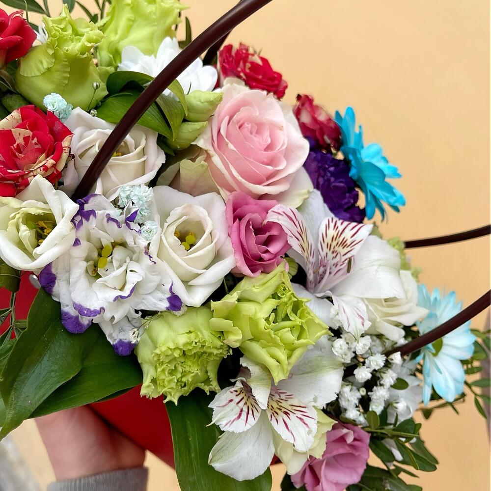 Роза – 1 шт.Альстромерия – 1 шт.Гвоздика – 1 шт.Лизиантус – 3 шт.Роза кустовая – 1 шт.Хризантема кустовая – 1 шт.Рускус сочи – 3 шт.Фисташка пучок – 1 шт.Оазис флористический – 1 шт.Сумочка картонная – 1 шт.Гипсофила – 1 шт.