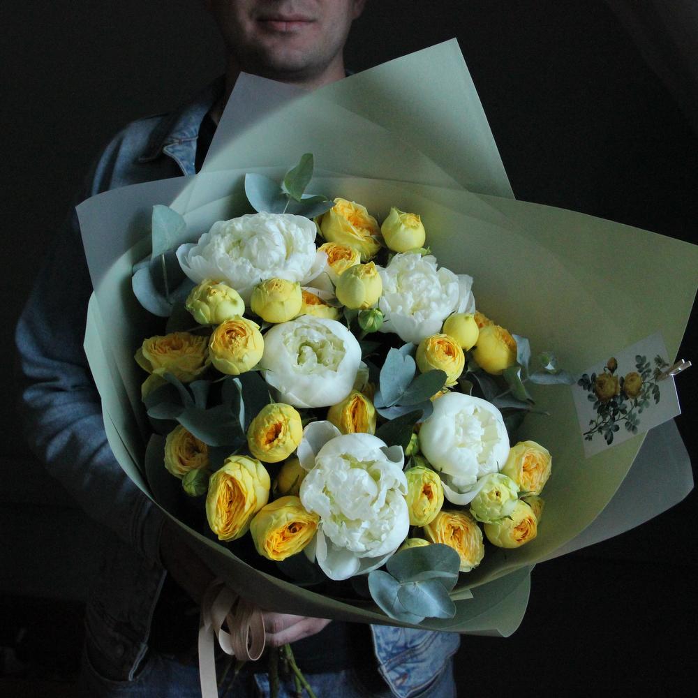 Пион белый – 5 шт.Пионовидная кустовая роза – 5 шт.Эвкалипт – 7 шт.Упаковка – 2 шт.Лента атласная – 2 шт.Открытка – 1 шт.