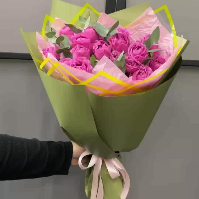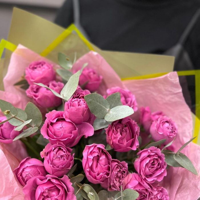 Эвкалипт – 3 шт.Лента атласная – 2 шт.Тишью – 2 шт.Пленка матовая – 4 шт.роза кустовая мисти бабл – 5 шт.пленка дизайнесркая с каймой – 2 шт.