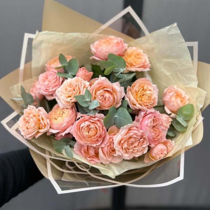роза пионовидная кустовая джульетта черри – 5 шт.Эвкалипт – 3 шт.Тишью – 2 шт.пленка дизайнерская с каймой – 2 шт.Пленка матовая – 4 шт.Лента атласная – 2 шт.