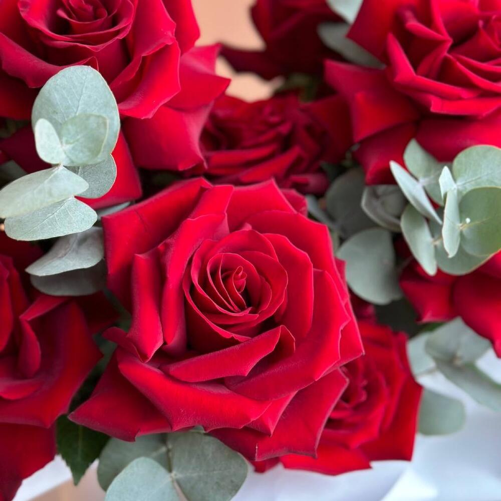 Яркий и запоминающийся букет из французских бархатных роз в элегантной белой упаковке. Аромат свежего эвкалипта подчеркнут тонкий шлейф роз.Особая техника обработки делает бутон больше обычного.Стойкость таких бутонов, как у садовой пионовидной розы от 3-5 дней