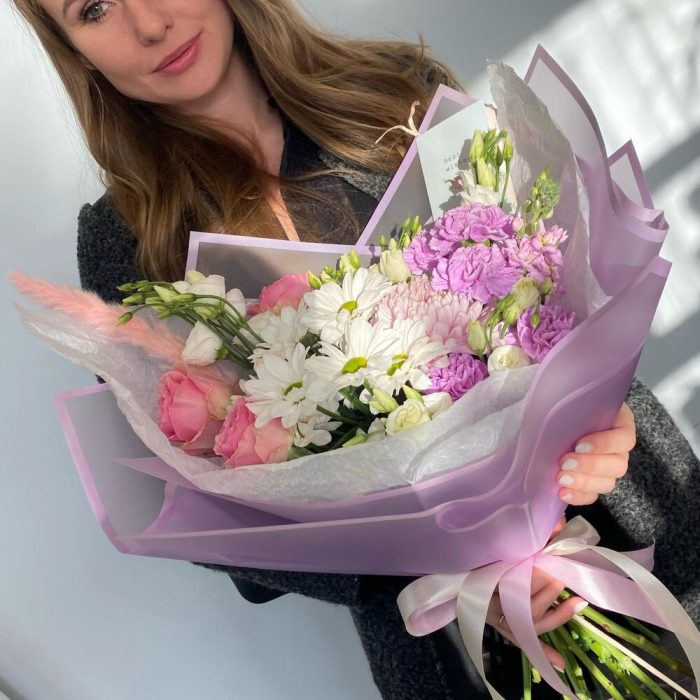 Маттиола – 1 шт.Хризантема кустовая – 1 шт.Роза – 3 шт.Упаковка – 4 шт.Эустома – 5 шт.Лента атласная – 3 шт.Хризантема одноголовая – 1 шт.Диантус лунный – 5 шт.пампасная трава – 1 шт.