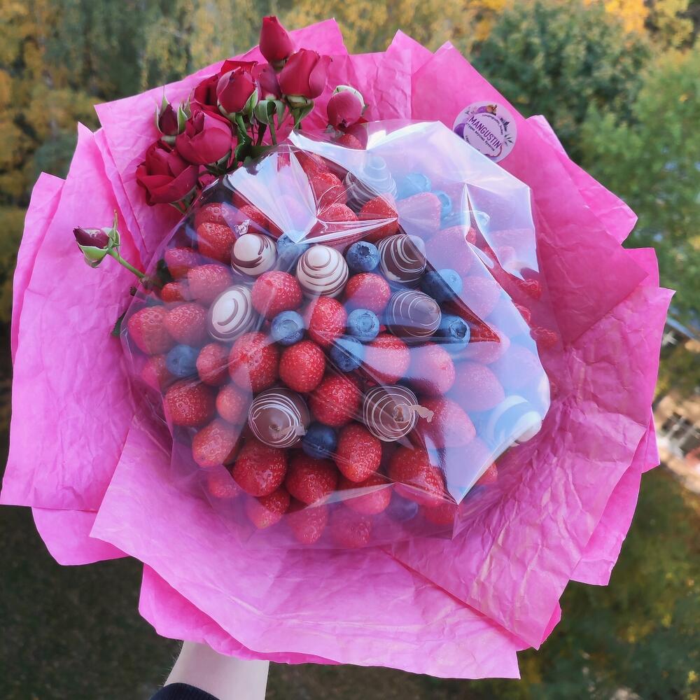 Клубника – 700 гр.Кустовая роза – 2 шт.клубника в бельгийском шоколаде – 200 гр.