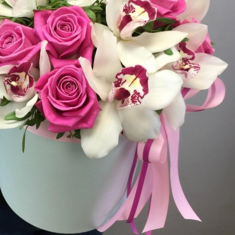 Орхидея Цимбидиум – 10 шт.Роза – 11 шт.Лента атласная – 1 шт.Шляпная коробка – 1 шт.Губка флористическая – 2 шт.зелень декоративная – 4 шт.