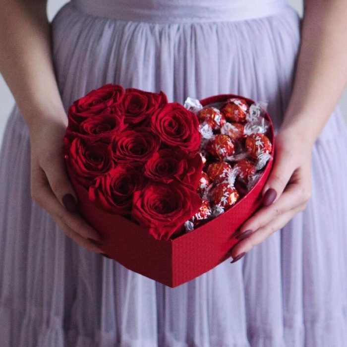 “Сладкое сердце ” – цветочная композиция с сладостями в коробке “Сердце”
