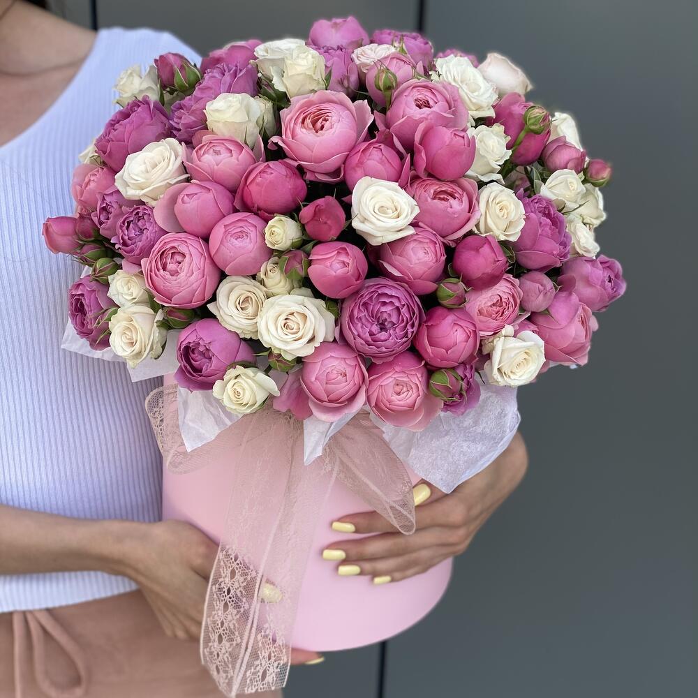 Оазис – 2 шт. Коробка – 1 шт. Кустовая пионовидная роза – 21 шт.