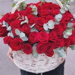 Корзина с 51 красной розой с эвкалиптом