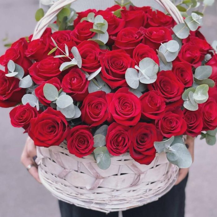 Плетеная корзина – 1 шт.Красная роза – 51 шт.Эвкалипт – 5 шт.Оазис флористический – 3 шт.
