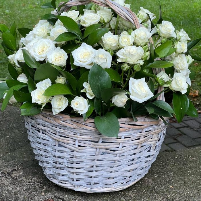 Рускус – 15 шт. Роза кустовая – 25 шт. Корзина плетеная – 1 шт.