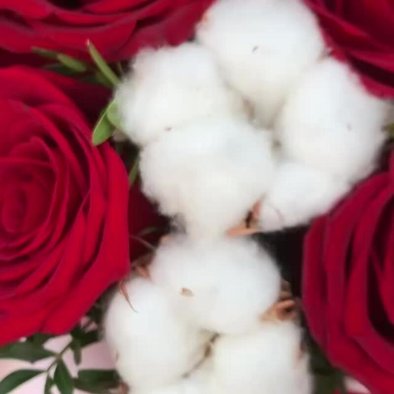 Коробка шляпная – 1 шт.Оазис флористический – 1 шт.Фисташка – 2 шт.Роза Эквадор – 9 шт.Хлопок натуральный – 9 шт.