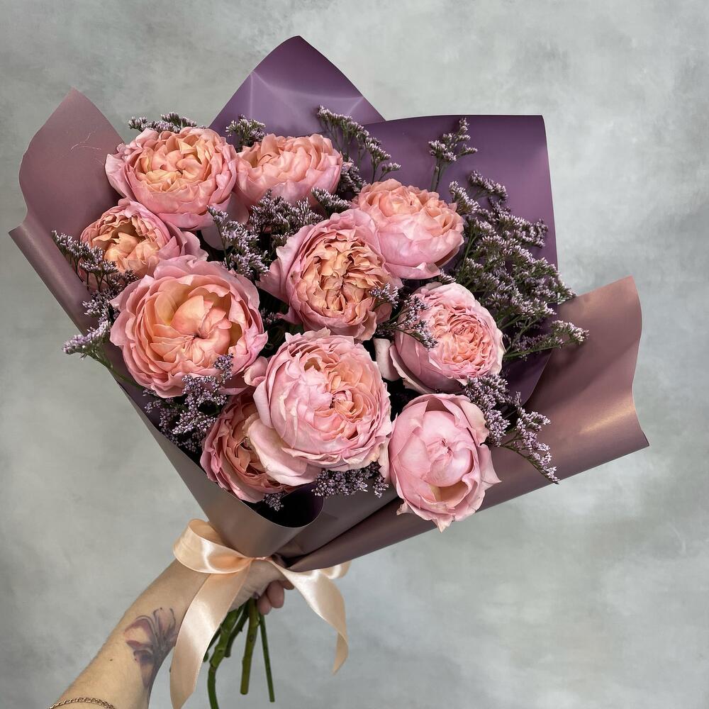 Лимониум – 2 шт.Упаковка – 1 шт.Роза кустовая джульетта – 3 шт.